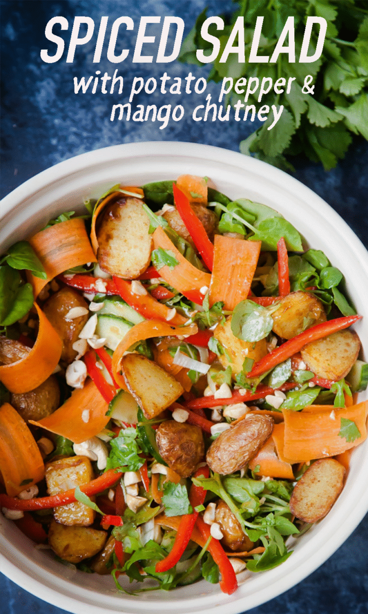 A fresh, flavourful and crunchy salad with roasted new potatoes, peppers and mango chutney. Filling enough to be a meal in itself or a smaller portion for a side-dish.