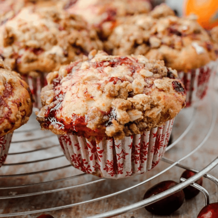 A great way to use leftover cranberry sauce! Light, fluffy muffins with a sweet, crunchy streusel topping.